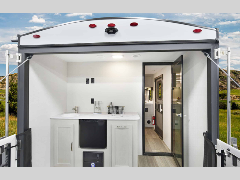There is over 40 cu. ft. of pass-through storage so you can bring all of the outdoor essentials, and the industry first under-bed pet palace design provides a cozy place for your pet too. The strong foundation consists of a powder coated structural I-beam frame and durable Azdel composite laminated sidewalls. You'll find night shades inside, along with hidden hinges on the cabinetry, multiple 110V and USB outlets, seamless edge kitchen countertops throughout, and many more comforts.