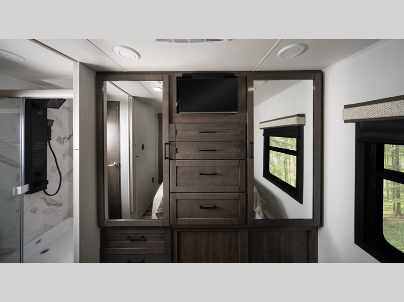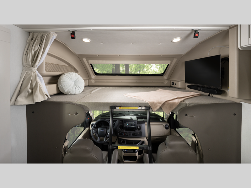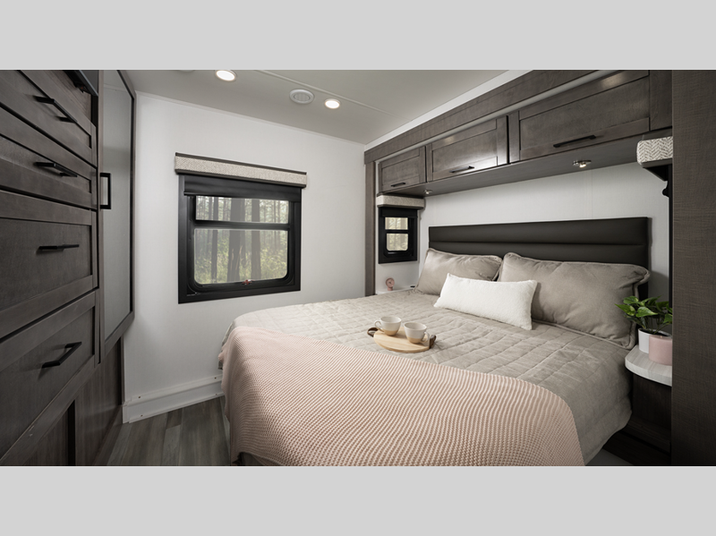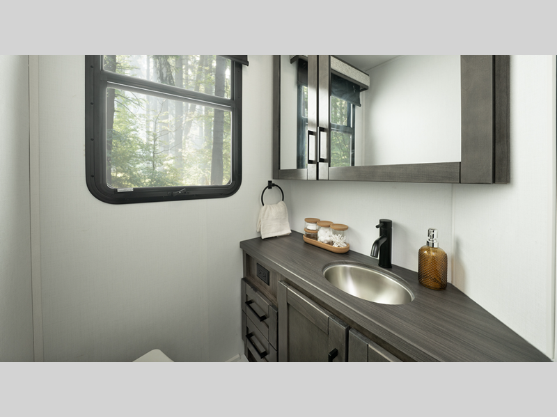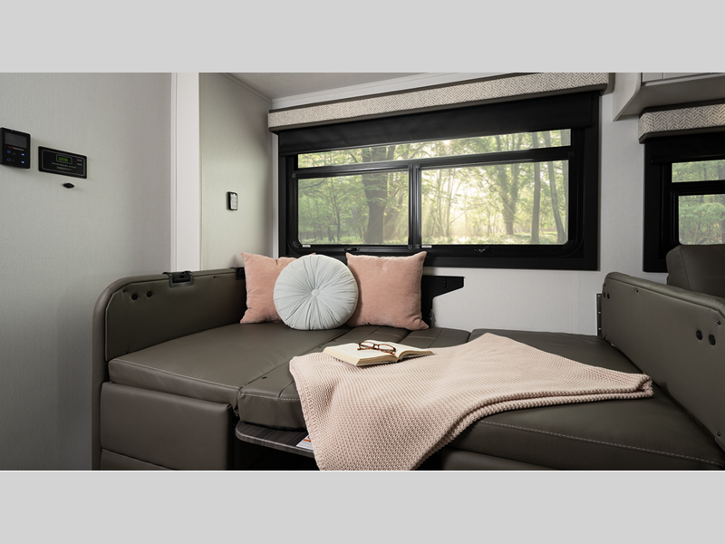 Each model includes a new Winegard 2.0 Wi-Fi/4G antenna and an LED HD Smart TV in the living room to wash away those rainy day blues. The full-body paint options are sure to turn heads, and you'll love the panoramic window with a shade in the front cap. The interior will have you feeling right at home with LED-lit hardwood fascia, hardwood cabinet doors, frameless windows, and decorative kitchen backsplash.
