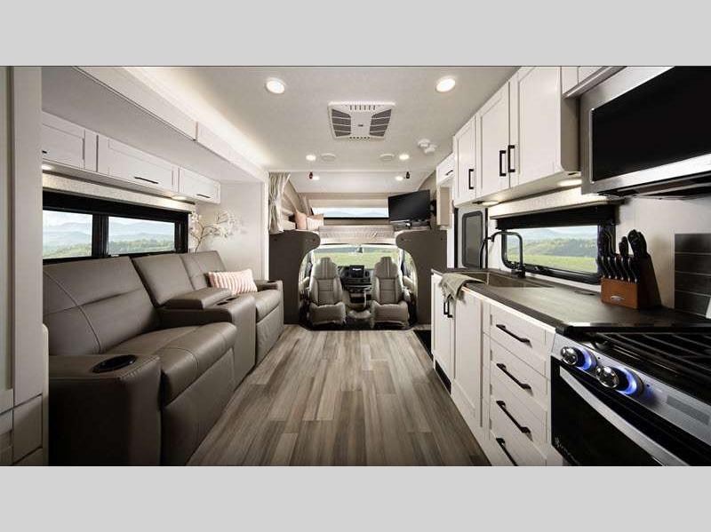 Each is built with a Stronghold VBL™ roof, floor, and sidewalls creating the lightest, yet strongest construction, and a one-piece, seamless fiberglass front cap that resists damage from moisture and debris. There are also aluminum running boards for easy entry into the cab and the main entrance which includes the industry's largest travel-view window and electric-powered step with an integrated house battery compartment. The interior offers seatbelts in all designed seating locations to protect your loved ones, hardwood cabinet doors and drawers for style and durability, high-intensity recessed LED ceiling lights and LED-lit slideout fascia, plus an interior command center and pleated blackout shades for privacy.