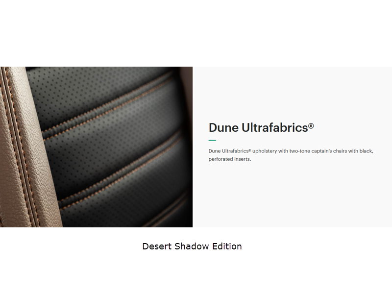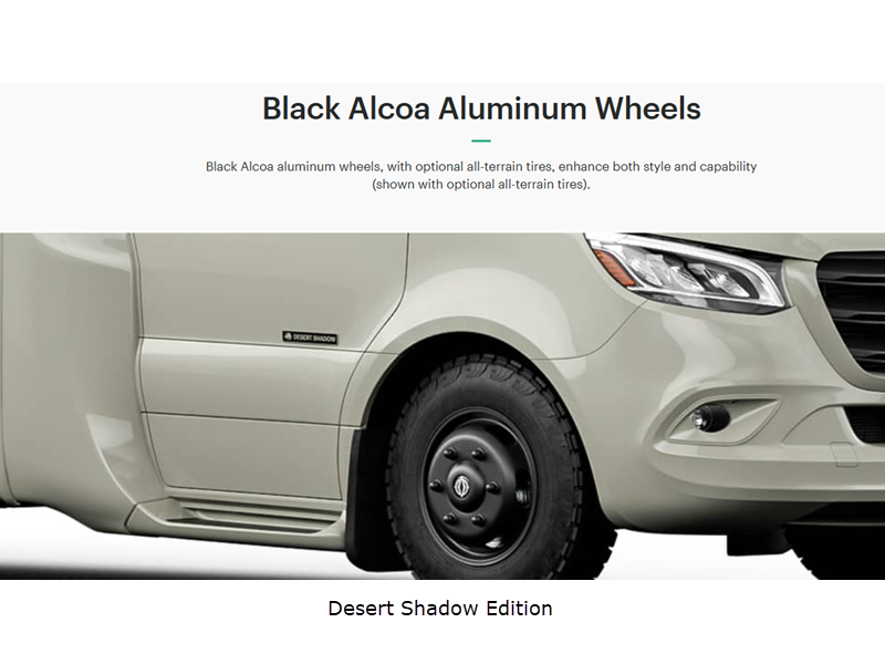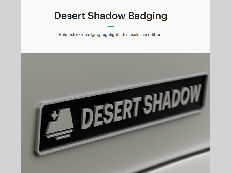 - Desert Shadow Edition Décor Package – Includes Alcoa Aluminum Wheels (6) with Black Finish, Desert Shadow Badge, Black Exterior Badging & Assist Handle, Black Tail Light Bezels, Black Interior Fixtures & Hardware, Black Grille, Stone Overhead Cabinets & Backsplash