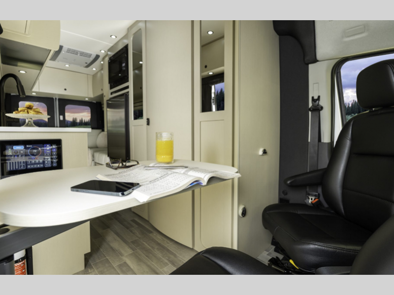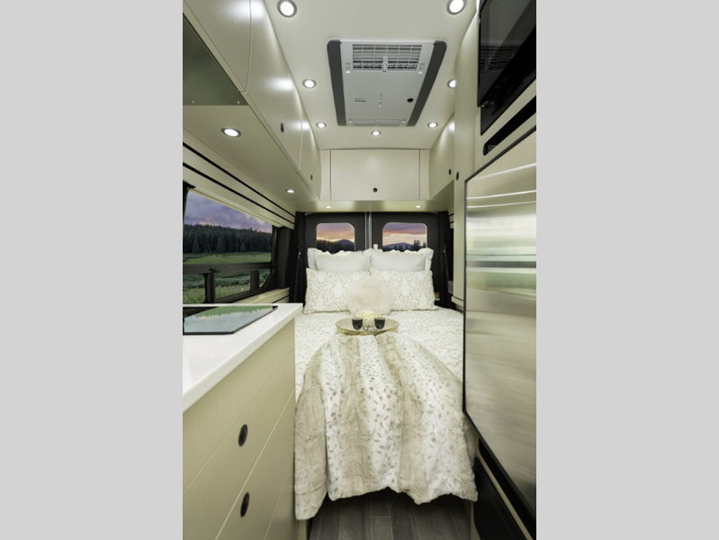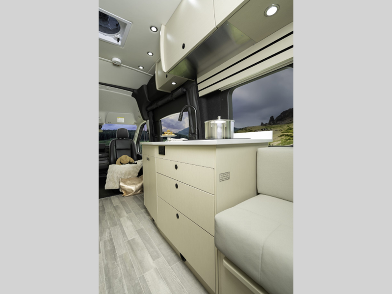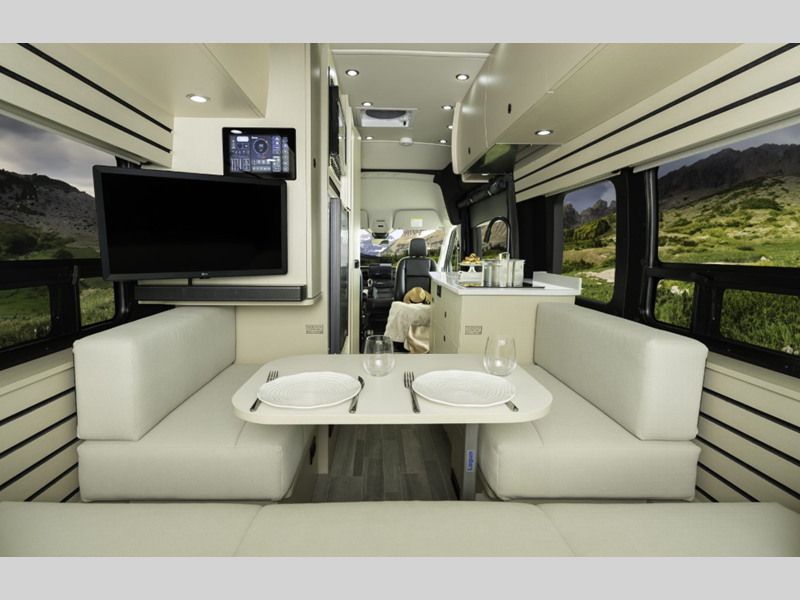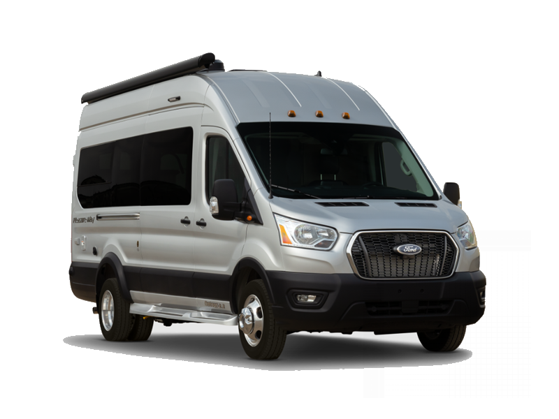 Sleeps 2 Length 21 ft 10 in Ext Width 8 ft 2 in Ext Height 10 ft Int Height 6 ft 6 in Interior Color Cashmere, Flint Exterior Color Ingot Silver Hitch Weight 2000 lbs GVWR 11000 lbs Fresh Water Capacity 28.2 gals Grey Water Capacity 15 gals Black Water Capacity 11 gals Tire Size 195/75R16C All-Season Furnace BTU 11500 btu Generator 2.8 KW Onan QG 2800i Fuel Type Gas Engine 3.5L EcoBoost V6 Chassis Ford Transit 350 AWD Horsepower 310 hp Fuel Capacity 25 gals Wheelbase 148 in Torque 400 ft-lb Refrigerator Type 12V Refrigerator Size 5.5 cu ft Cooktop Burners 1 Number of Awnings 1 LP Tank Capacity 12 gals Water Heater Type Truma AquaGo Comfort Plus AC BTU 11000 btu TV Info 24" Smart LED TV Awning Info Power with LED Lights Gross Combined Weight 13000 lbs Shower Type Wet/Bath Shower Electrical Service 30 amp