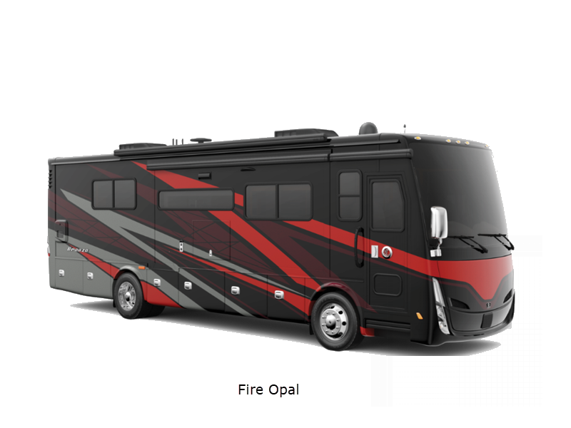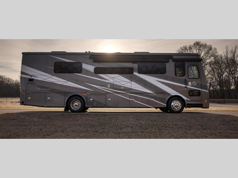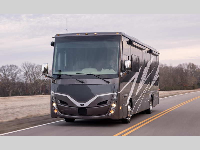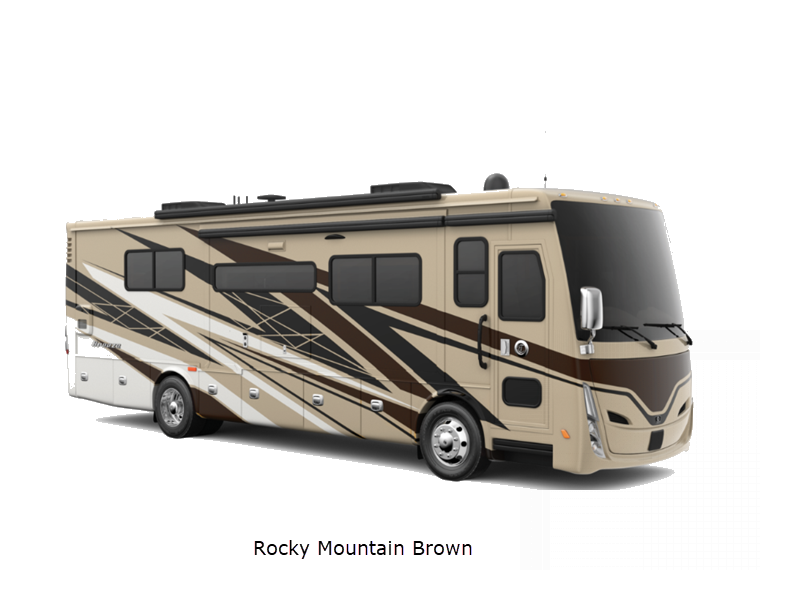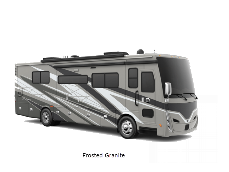 Sleeps 5 Slides 3 Length 33 ft 2 in Ext Width 7 ft 11 in Ext Height 11 ft 8 in Int Height 6 ft 6 in Interior Color Waypoint Exterior Color Fire Opal, Frosted Granite, Rocky Mountain Brown Hitch Weight 5000 lbs GVWR 25500 lbs Fresh Water Capacity 70 gals Grey Water Capacity 50 gals Black Water Capacity 33 gals Tire Size 265/70R19.5 Furnace BTU 60000 btu Generator 6.0 kw Onan Quiet Diesel Fuel Type Diesel Engine Cummins B6.7 Chassis PowerGlide Raised Rail Rear Horsepower 340 hp Fuel Capacity 70 gals Wheelbase 202 in Available Beds King Torque 700 ft-lb Refrigerator Type Stainless Steel Residential with Top Freezer Refrigerator Size 12 cu ft Convection Cooking Yes Cooktop Burners 3 Shower Size 28.5" x 40.5" Number of Awnings 2 Axle Weight Front 9500 lbs Axle Weight Rear 16000 lbs LP Tank Capacity 20 gals Water Heater Type Truma AquaGo Comfort Instant AC BTU 27000 btu Basement Storage 94 cu. ft. TV Info LR TV, BR TV, Exterior TV Awning Info Girard Side-Mounted Power w/Integrated LED Lighting Washer/Dryer Available Yes Gross Combined Weight 30500 lbs Shower Type Standard Electrical Service 50 amp Similar Floorplans
