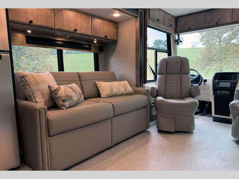 The living area is bright and airy with high-end furnishings and finishes like the Tiffin handcrafted cabinetry with an impressive storage capacity. You will find exclusive Tiffin innovations from the inside out. Some of these features are the premium paint system, heavy-duty side-swinging compartment doors, and the PowerGlide chassis. You will love traveling on Montage power captain's seats, and there side-view cameras along with a color backup camera to easily park at the campground.