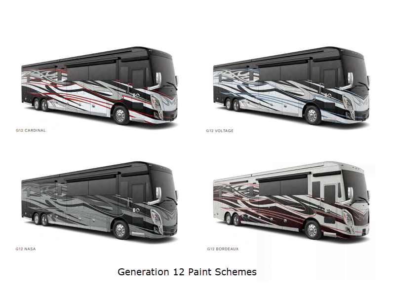 Sleeps 6 Slides 4 Length 45 ft Ext Width 8 ft 5 in Ext Height 13 ft 4 in Int Height 6 ft 11 in Interior Color Enchantment, Mystic Exterior Color Gen 12, Gen 13 Paint Schemes; Cardinal, Voltage, Nasa, Bordeaux Hitch Weight 20000 lbs GVWR 54000 lbs Fresh Water Capacity 100 gals Grey Water Capacity 100 gals Black Water Capacity 55 gals Generator 12.5 kW Onan Quiet Diesel Fuel Type Diesel Engine Cummins X15 Chassis PowerGlide Horsepower 605 hp Fuel Capacity 150 gals Wheelbase 316 in Available Beds King Torque 1950 ft-lb Refrigerator Type Stainless Steel Residential w/French Doors and Bottom Freezer Refrigerator Size 22 cu ft Convection Cooking Yes Shower Size 32" x 48" Number of Awnings 2 Axle Weight Front 20000 lbs Axle Weight Rear 20000 lbs Axle Weight Tag 14000 lbs AC BTU 45000 btu Basement Storage 237 cu. ft. TV Info LR TV, BR TV, Ext. TV Awning Info Girard Power with Integrated LED Lighting Gross Combined Weight 74000 lbs Shower Type Shower w/Seat Electrical Service 50 amp Similar Floorplans